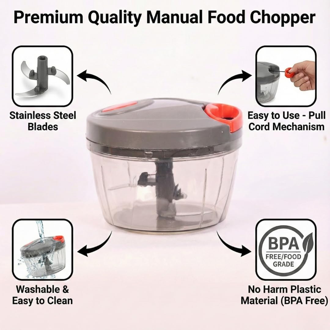 Make cooking faster and easier with this compact manual vegetable and fruit chopper. Featuring 3 sharp stainless steel blades, it delivers quick, uniform chopping of onions, garlic, herbs, fruits, and vegetables. The BPA-free food-grade body ensures safe and long-lasting use. Perfect for mess-free, time-saving kitchen prep without electricity.